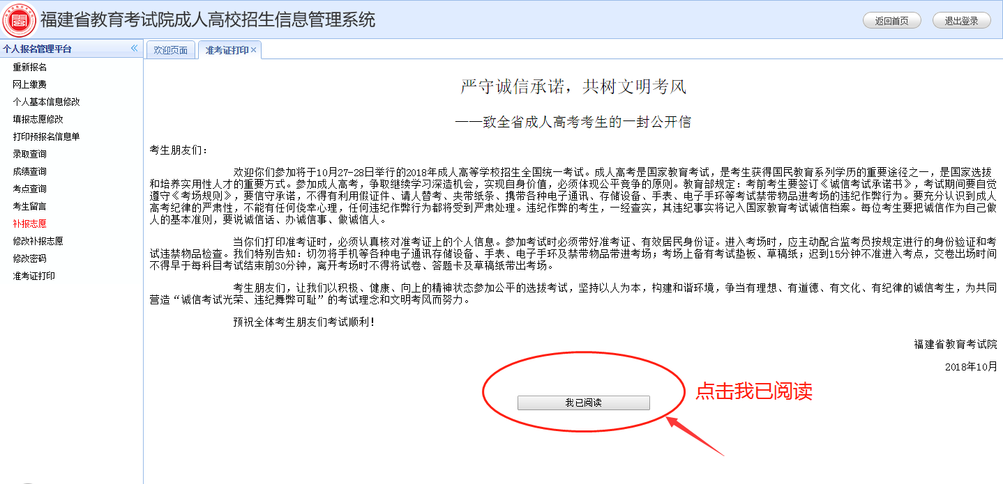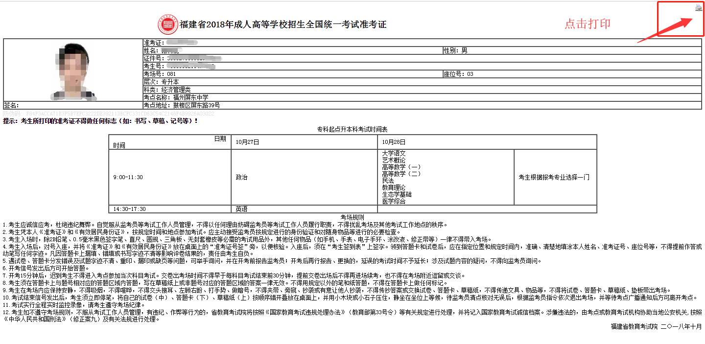 【導讀】2018年福建成人高考考試時間為10月27、28日,準考證打印的時間為10月19日-10月26日,接下來是福建成考網為考生們準備的準考證打印詳細流程,希望考生們早日完成準考證打印然后參加考試!