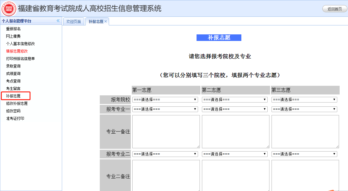 志愿補報地址:http://m.49251.cn/cjcx (此地址也可以查詢錄取結果),點擊進入,使用用戶名和密碼登陸,點擊左側“補報志愿”。