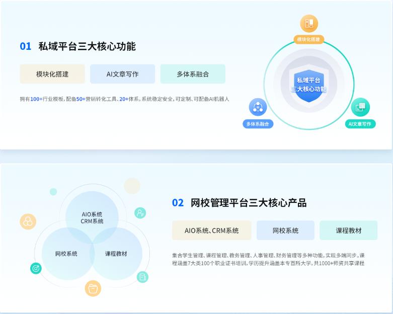 易職邦科技擁有100+行業(yè)模板,配備50+營銷轉(zhuǎn)化工具,20+體系,系統(tǒng)穩(wěn)定安全,可定制、可配備AI機器人!集合學(xué)生管理、課程管理、教務(wù)管理、人事管理、財務(wù)管理等多種功能,實現(xiàn)多端同步。課程涵蓋7大類100個職業(yè)證書培訓(xùn),學(xué)歷提升涵蓋本專百所大學(xué),共1000+師資共享課程!