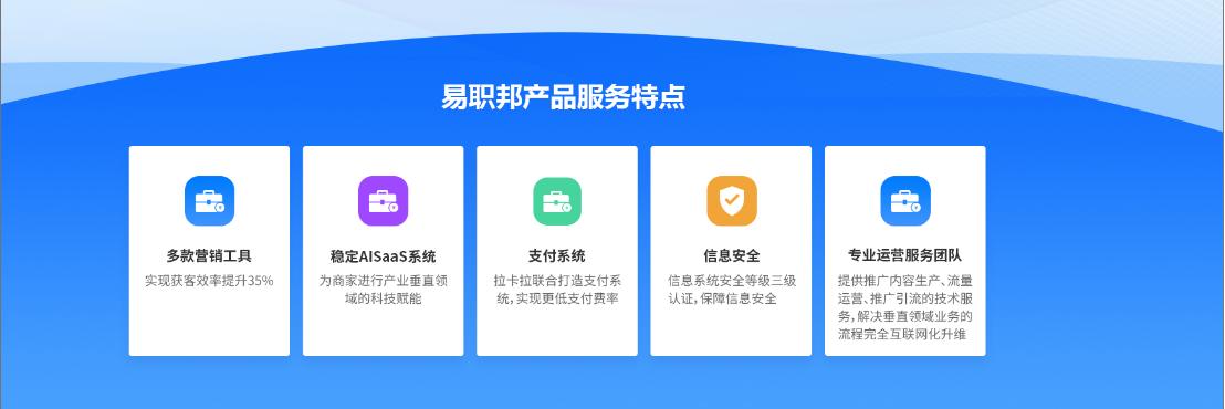 易職邦科技擁有多條優(yōu)質(zhì)產(chǎn)品線,包括:模板小程序、定制小程序、AI論文、AIO/CRM系統(tǒng)、網(wǎng)校搭建、課程教材、學(xué)歷培訓(xùn)與代運營服務(wù)。