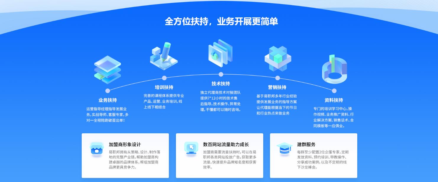 易職邦科技從業(yè)務(wù)、培訓(xùn)、技術(shù)、營銷、資料五大角度提供全方位扶持!助力加盟商更好開展業(yè)務(wù)!