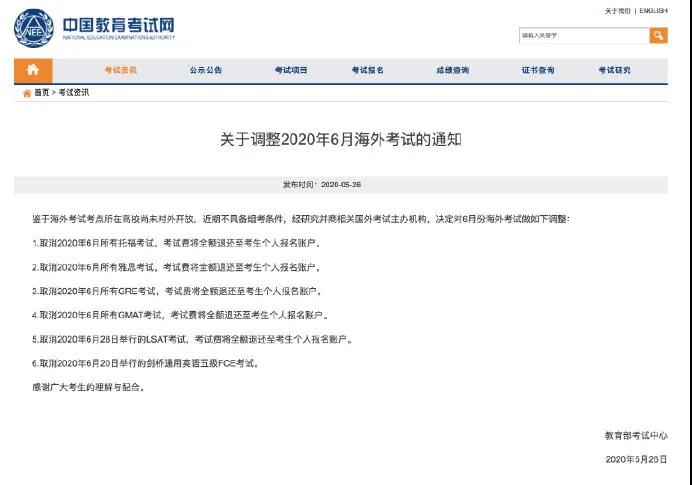 鑒于海外考試考點(diǎn)所在高校尚未對(duì)外開放,近期不具備組考條件,經(jīng)研究并商相關(guān)國(guó)外考試主辦機(jī)構(gòu),決定對(duì)6月份海外考試做如下調(diào)整: