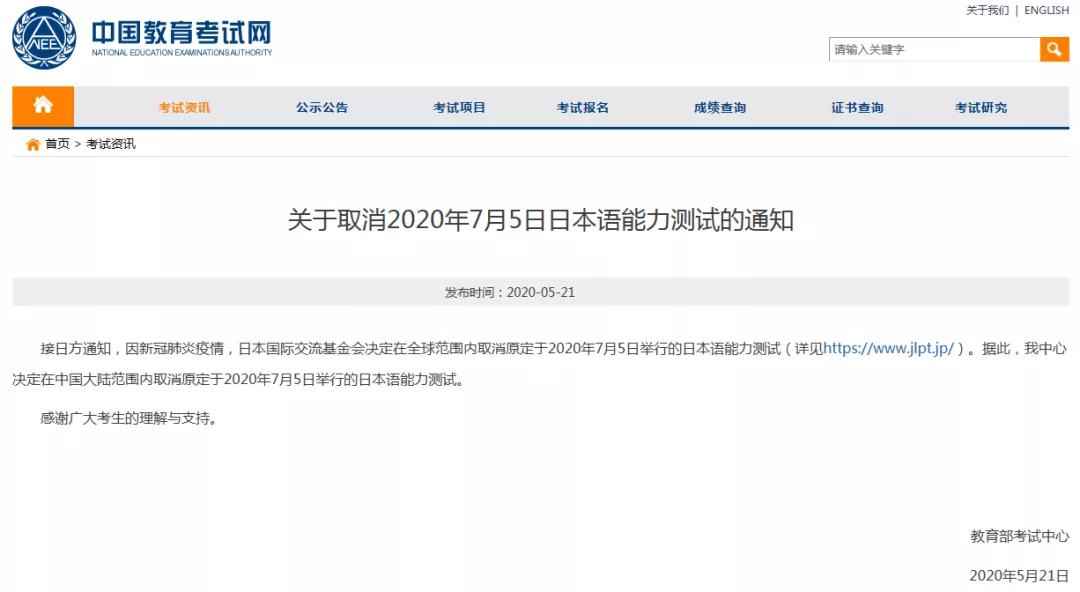 接日方通知,因新冠肺炎疫情,日本國(guó)際交流基金會(huì)決定在全球范圍內(nèi)取消原定于2020年7月5日舉行的日本語能力測(cè)試(詳見https://www.jlpt.jp/)。據(jù)此,我中心決定在中國(guó)大陸范圍內(nèi)取消原定于2020年7月5日舉行的日本語能力測(cè)試。